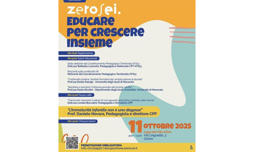 Conto alla rovescia in vista dell’atteso convegno dedicato all’Educazione dei più piccoli che si terrà nella sede della Lega del Filo d’Oro di Osimo (Ancona), in programma per sabato prossimo 11 Ottobre. Vi parteciperanno studiosi, docenti, educatori, famiglie. Promosso dall’”Ambito Territoriale 13” e dal “Coordinamento Pedagogico Territoriale 0-6 anni”, l’incontro avrà come ospite d’eccezione e relatore principale il pedagogista Daniele Novara, docente all’Università Cattolica di Milano e fondatore del Centro Psico-Pedagogico di Piacenza (CPP), che parlerà del tema “L’immaturità infantile non è una diagnosi”. Un particolare aspetto dell’età evolutiva dei più piccoli legato alla consapevolezza, ricorda il professor Novara nell’anticipare la cornice dei contenuti dell’assise, che i bambini hanno il diritto di essere semplicemente ciò che sono: curiosi, fantasiosi, pieni di energia. È attraverso il gioco, il movimento e l’immaginazione che – aggiunge il docente - imparano a conoscere sé stessi e il mondo. Quante volte, nel lavoro educativo, ad esempio, si sente dire: “Non sta mai fermo!”. Oppure: “Non riesce a concentrarsi!”. Eppure, nella fascia 0-6 anni, la vivacità e la disattenzione sono parte del naturale processo di crescita, sottolinea il pedagogista, che interverrà al convegno con l’obiettivo – si legge in una nota - di riflettere insieme su come accompagnare i bambini rispettando i loro tempi evolutivi, senza chiedere loro di essere “grandi” troppo presto.